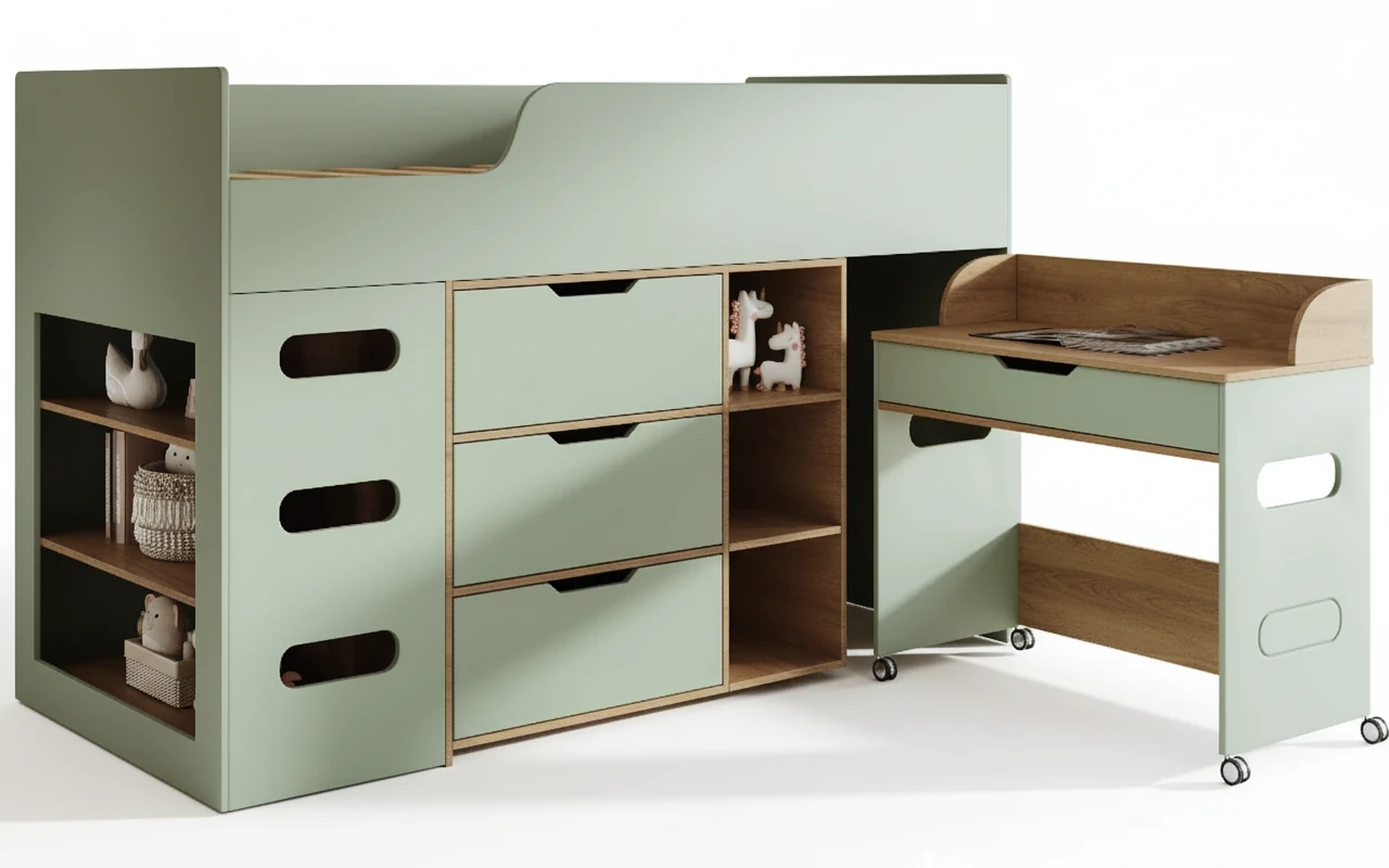 تخت مرتفع این سرویس، ساختاری یکتکه و محکم دارد که در طراحی آن توجه ویژهای به ایمنی و کاربردی بودن شده است. پلههای جانبی با گوشههای گرد و فضاهای کشودار، نهتنها راهی ایمن به طبقه بالا فراهم میکنند بلکه نقش باکس ذخیرهسازی را نیز برعهده دارند. در بخش زیر تخت، میز تحریر چرخدار قرار گرفته که بهراحتی قابل حرکت است و فضای مطالعهی کودکان و نوجوانان را شخصی و قابل تنظیم میسازد.
