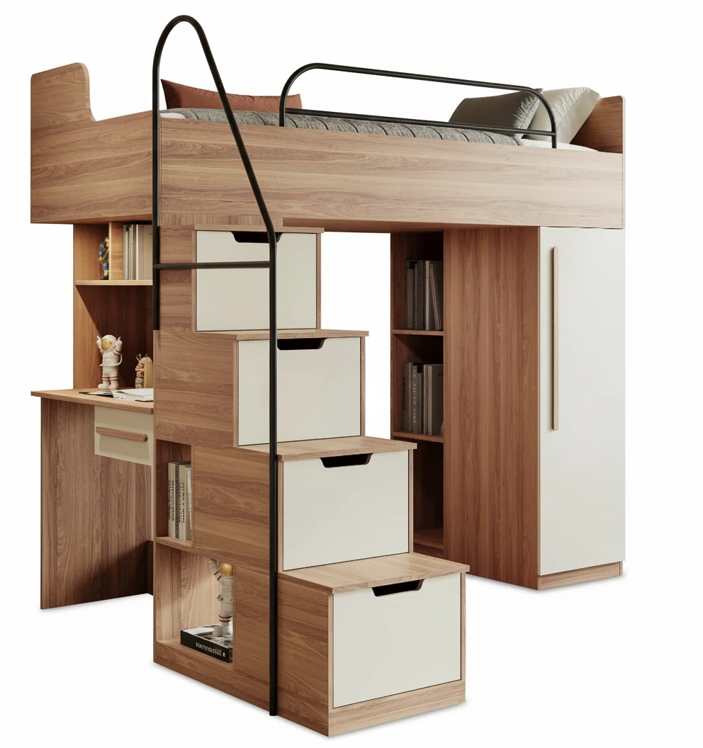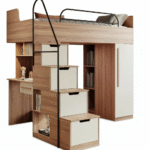 تخت مرتفع مجموعه با ارتفاع استاندارد و بدنه‌ای از چوب گردویی روشن ساخته شده که با صفحات سفید کرمی تضاد دلنشینی ایجاد کرده است. پله‌های طبقه بالا به‌صورت باکس‌دار طراحی شده‌اند تا علاوه بر دسترسی راحت و ایمن به تخت، هر پله نقش کشو یا باکس مخصوص نگهداری وسایل را نیز ایفا کند. این طراحی هوشمندانه به نوجوانان اجازه می‌دهد اسباب‌بازی‌ها، کتاب‌ها یا لوازم روزمره خود را همیشه منظم و در دسترس داشته باشند.