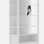 کتابخانه بلند و مدرن با طراحی هماهنگ با تاج تخت و دراور برای نگهداری کتاب و وسایل تزئینی.