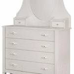 دراور آینهدار با آینه منحنی و قابدار خود، مهمترین نقطه بصری اتاق است. این آینه با طراحی نرم و ظریف، در کنار دستههای ظریف کشوها، تصویری از لطافت و نظم را القا میکند. کشوها فضای کافی برای لباسها و لوازم شخصی فراهم کردهاند و در عین حال، سطح رویی دراور میتواند به عنوان میز آرایش نیز مورد استفاده قرار گیرد.