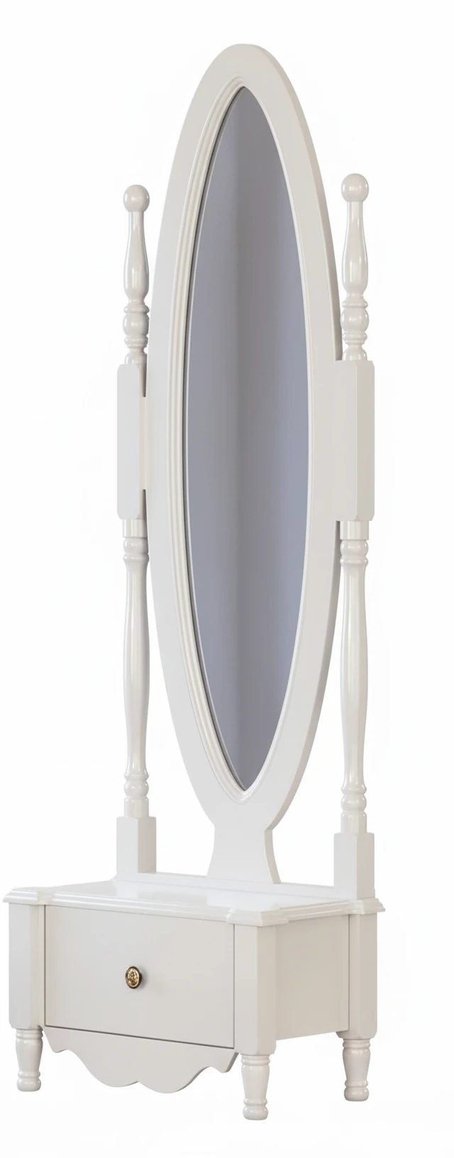 تاج تخت با انحنای زیبا و تزئینات برجسته، در مرکز توجه اتاق قرار میگیرد. پایههای تخت و میزها با تراش ظریف و فرم ستونمانند، هویت اصیل طراحی را کامل میکنند. دراور آینهدار با قابهای منحنی و سه کشوی کاربردی، ترکیبی از زیبایی و کاربرد است؛ در کنار آن، میز آرایش با طراحی مشابه و پایههای ظریف، هماهنگی فوقالعادهای در چیدمان ایجاد میکند. پاتختی کوچک و کمد دودرب با بخشهای قوسدار بالا، نظم و تکمیل بصری مجموعه را تضمین مینمایند.