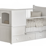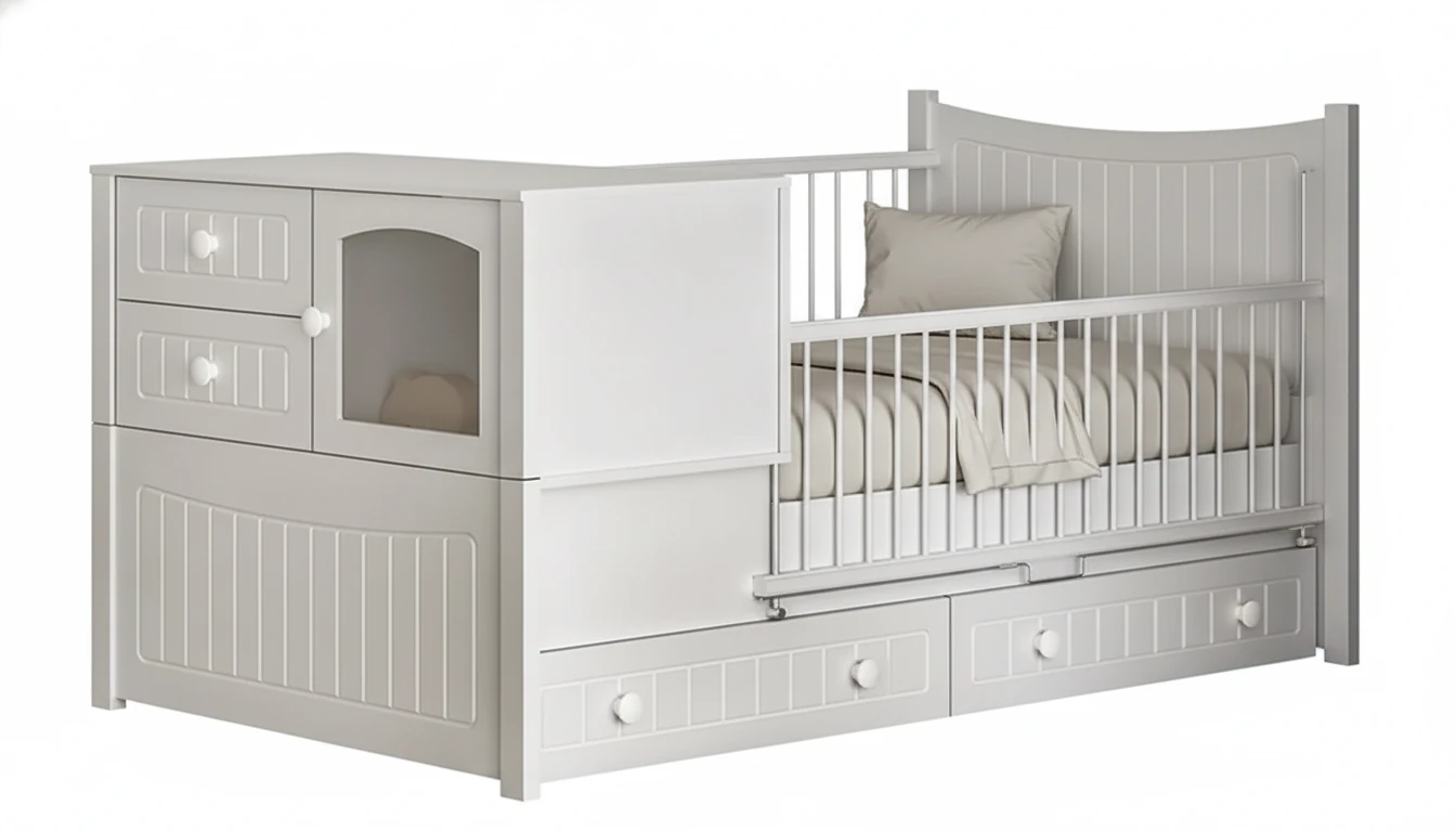 تخت نوزادی چندمنظوره نارین‑2 با ترکیب تخت، باکس دراور و بخش تعویض پوشک، برای والدینی طراحی شده که بهدنبال راحتی و استفاده بهینه از فضا هستند. نردههای سفید ایمن، با فاصلهگذاری استاندارد، امنیت خواب نوزاد را تضمین میکنند. بخش کناری تخت شامل کشوها و محفظههای کوچک برای وسایل روزمره نوزاد است و با رشد کودک میتواند به تخت نوجوانی تبدیل شود تا استفاده طولانیمدت و اقتصادیتری داشته باشد.