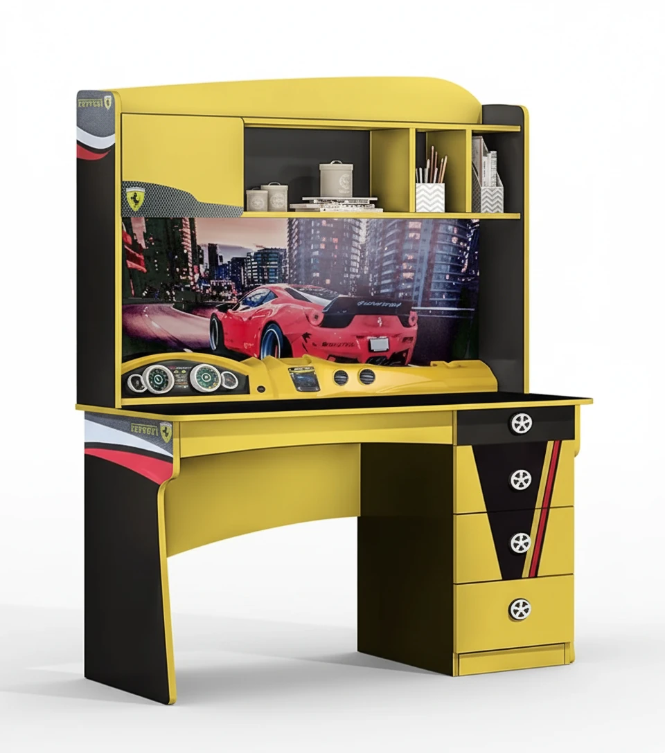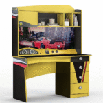 میز تحریر همراه با کتابخانهی بالایی، در همان ترکیب رنگ زرد و مشکی طراحی شده است. این میز ضمن ظاهر اسپرت خود، فضای کافی برای مطالعه، بازی و نگهداری وسایل شخصی نوجوان فراهم میکند. جزئیات تزئینی الهامگرفته از کنسول خودرو و خطوط کرومی روی بدنه، جذابیت طراحی را دوچندان کردهاند.