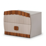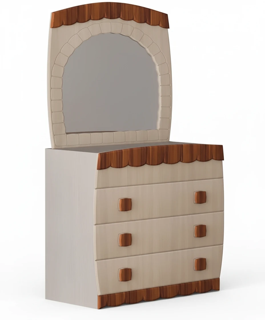 در کنار تخت، پاتختی کوچک با طراحی هماهنگ و دو رنگ متضاد، فضای کاربردی برای قرار دادن وسایل روزمره مانند کتاب، چراغ خواب یا تلفن همراه فراهم کرده است. دراور آینهدار نیز با همان سبک طراحی و قوسهای چوبی در قسمت بالایی، نمایی زیبا و کامل به اتاق میبخشد و محلی مرتب برای نگهداری لباسها و لوازم شخصی فراهم میکند.