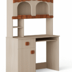 میز تحریر این سرویس با طراحی ویژه و قفسههای کتابخانهای در قسمت بالا، فضای لازم برای مطالعه، کارهای روزمره و چیدمان منظم کتابها را ایجاد کرده است. ترکیب رنگ روشن بدنه با بافت گرم چوبی لبهها جلوهای متعادل میان سادگی و زیبایی به فضا میدهد.