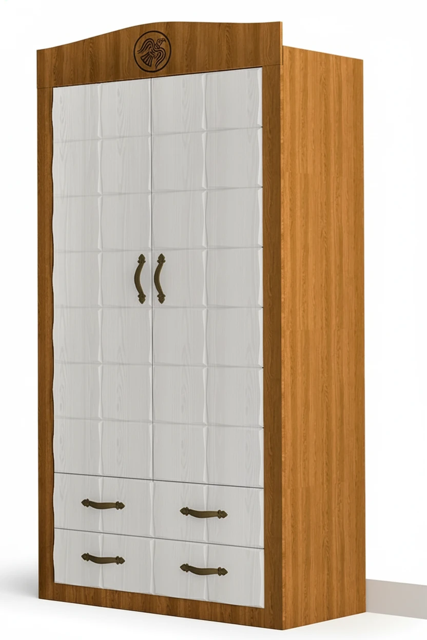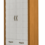 کمد لباس ترنج‑1 با طراحی قابدار و تلفیق رنگی هماهنگ، هویت مجموعه را کامل میکند. بخش سفید وسط کمد با بافت مربعی ظریف، تضاد چشمنوازی با قاب چوبی پیرامونش دارد. وجود طبقات، بخش آویز و سه کشو در پایین، استفاده بهینه از فضا را برای والدین ممکن میکند.
