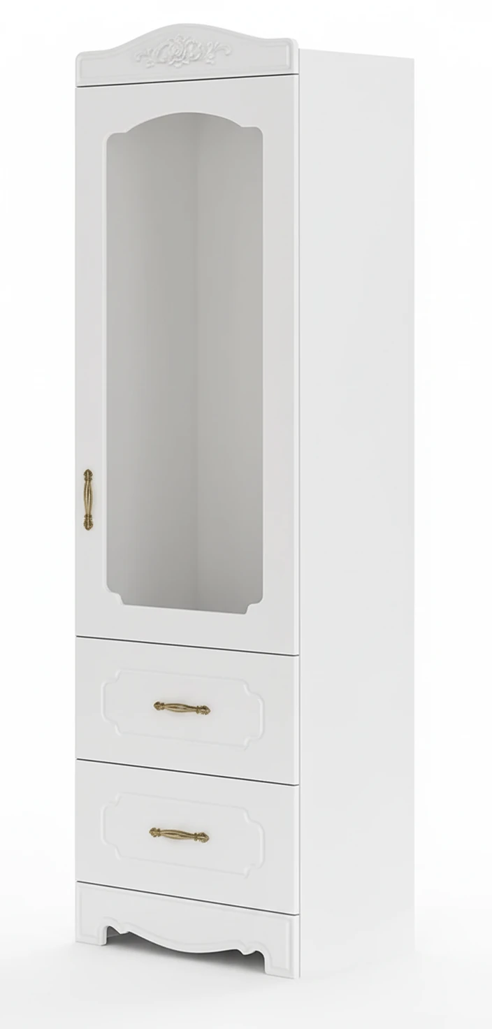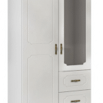 کمد دودرب پردیس‑2 با ترکیب بخش ویترینی شیشهای و کشوهای پایینی، هماهنگی کاملی با طراحی تخت دارد. این کمد فضای داخلی کافی برای لباسها، پتوها و لوازم کودک فراهم میکند و قوس ملایم در بالای درها، ظاهری ظریف و چشمنواز به آن بخشیده است. ویترین کناری مجموعه نیز با قفسههای طبقهبندیشده، جایگاهی عالی برای عروسکها، کتابها یا وسایل تزئینی کودک فراهم میآورد.