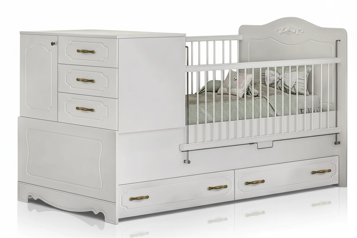 تخت نوزادی این مجموعه با ساختار دومنظوره طراحی شده است تا همزمان با رشد کودک، قابلیت استفاده بلندمدت داشته باشد. حفاظهای متحرک تخت، ایمنی کامل را هنگام خواب نوزاد تضمین میکنند. بخش زیرین تخت دارای سه کشوی عریض برای نگهداری ملحفه و لوازم ضروری است و قسمت کناری آن به شکل دراور و میز تعویض طراحی شده تا استقلال و راحتی والدین را افزایش دهد. پس از دوران نوزادی، این تخت با برداشتن باکس بالا، به تخت نوجوانی تبدیل میشود.
