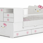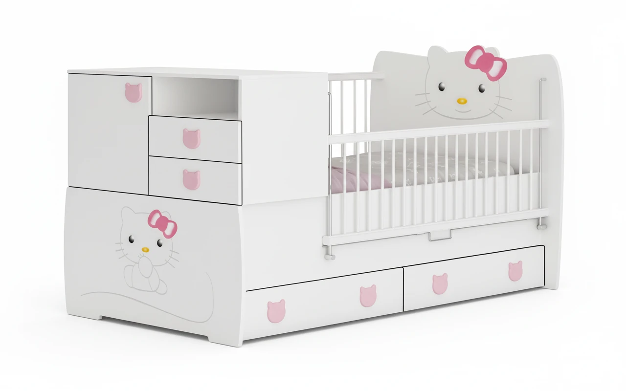 سرویس خواب نوزادی کتیا ۲ از برند بیبیهوم نمونهای جذاب از ترکیب لطافت طراحی فانتزی با عملکرد کاربردی است. این مجموعه با الهام از دنیای کارتونی Hello Kitty، در نگاه نخست فضایی سرشار از آرامش، محبت و لطافت کودکانه را تداعی میکند. رنگ سفید براق با جزئیات صورتی پاستلی، فرمهای منحنی در تاجها و دستگیرههای گربهای، همگی در جهت خلق محیطی دلپذیر و صمیمی برای نوزاد طراحی شدهاند. طراحی مجموعه باعث میشود اتاق کودک نهتنها زیبا، بلکه منظم و کاربردی باشد.