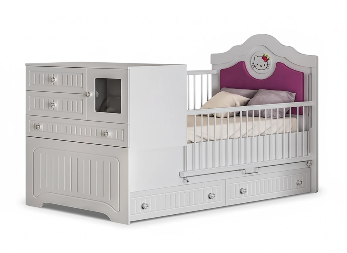 سرویس خواب نوزادی کت تاجدار ۲ از برند بیبیهوم انتخابی عالی برای خانوادههایی است که زیبایی و لطافت را در کنار کارایی جستوجو میکنند. طراحی فانتزی این مجموعه با تاج گربهای بامزه، رنگ سفید درخشان و جزئیات بنفش پاستلی، محیطی آرام و دلنشین برای نوزاد ایجاد میکند. خطوط عمودی در طراحی بدنه و انحنای نرم در ساقها و تاج تخت به فضا حس نظم و لطافت میبخشد.